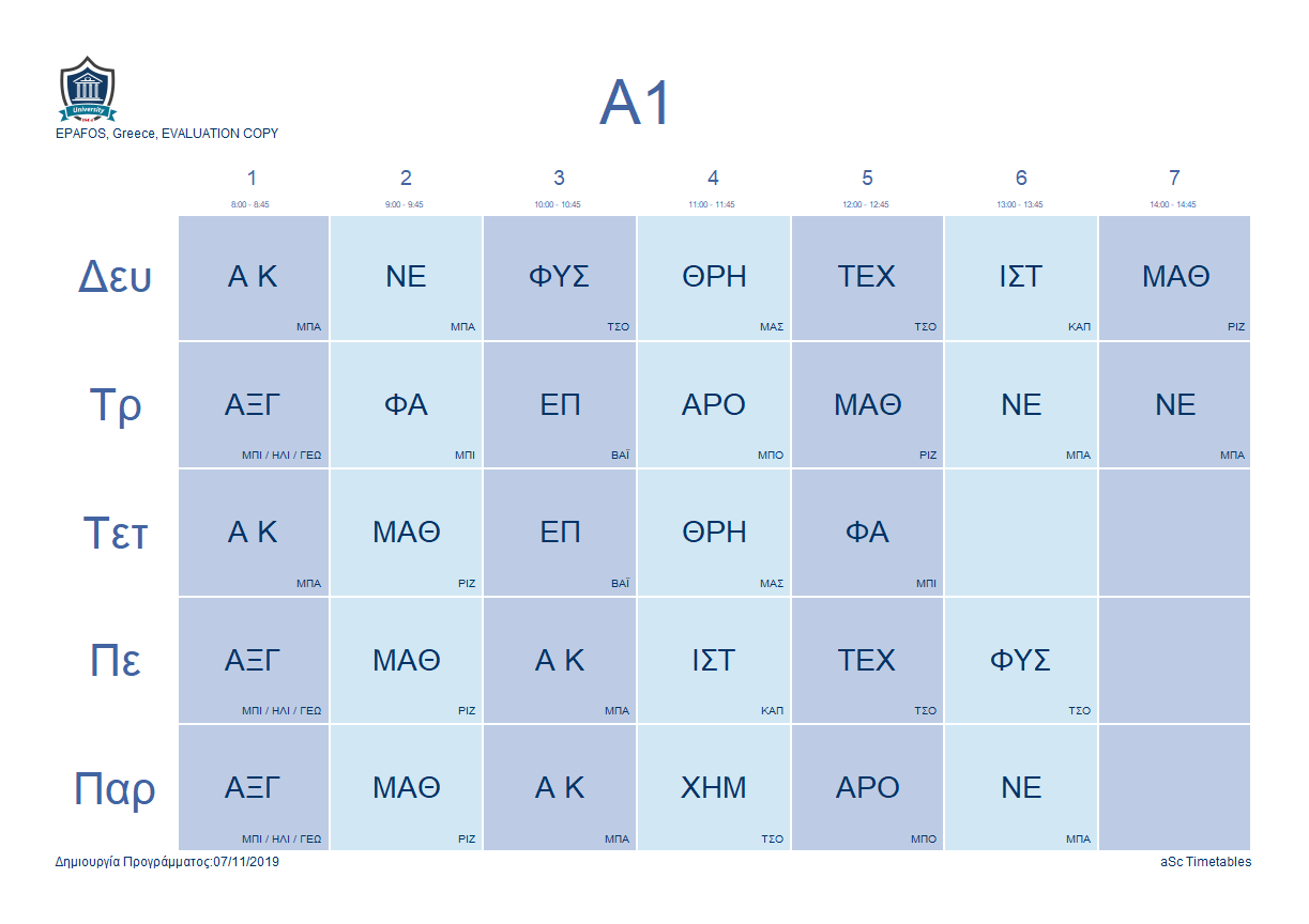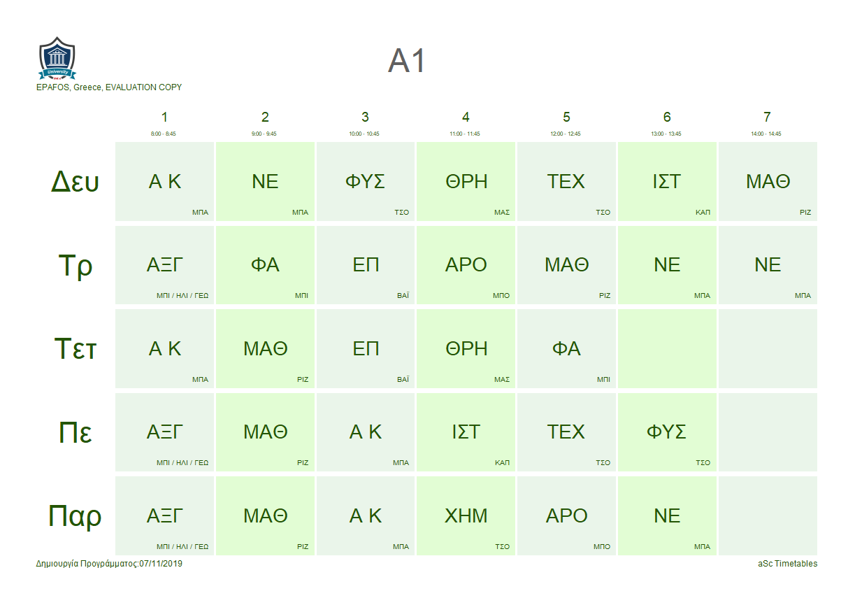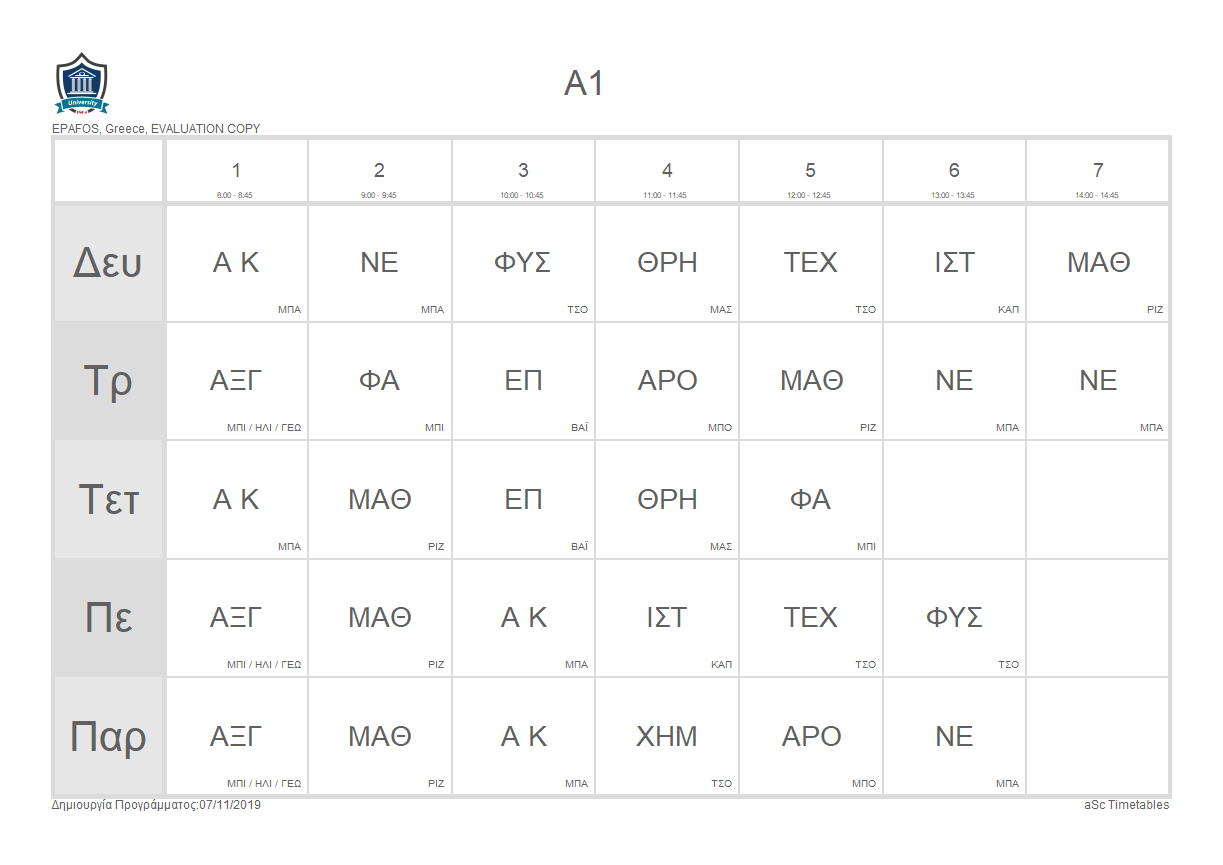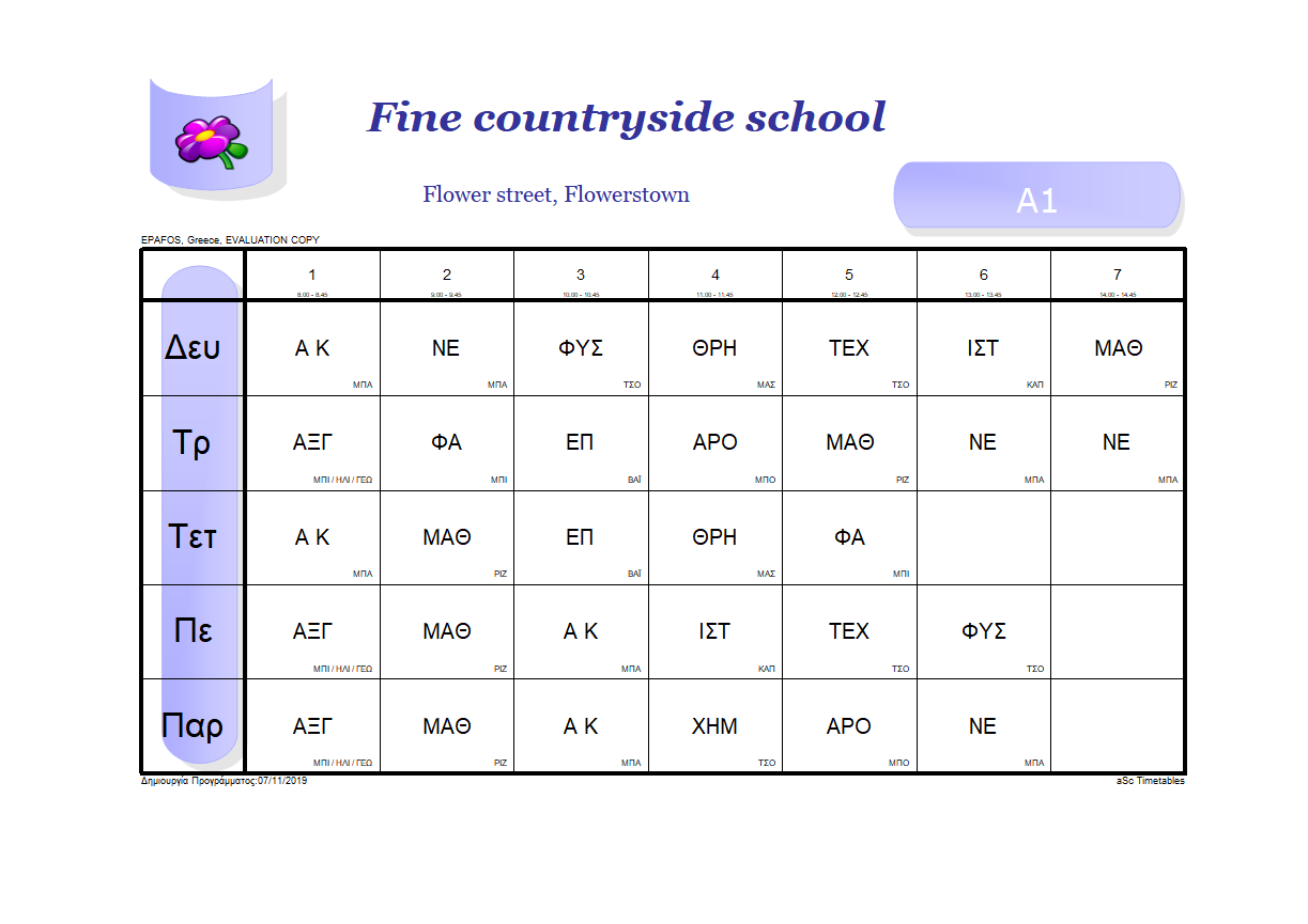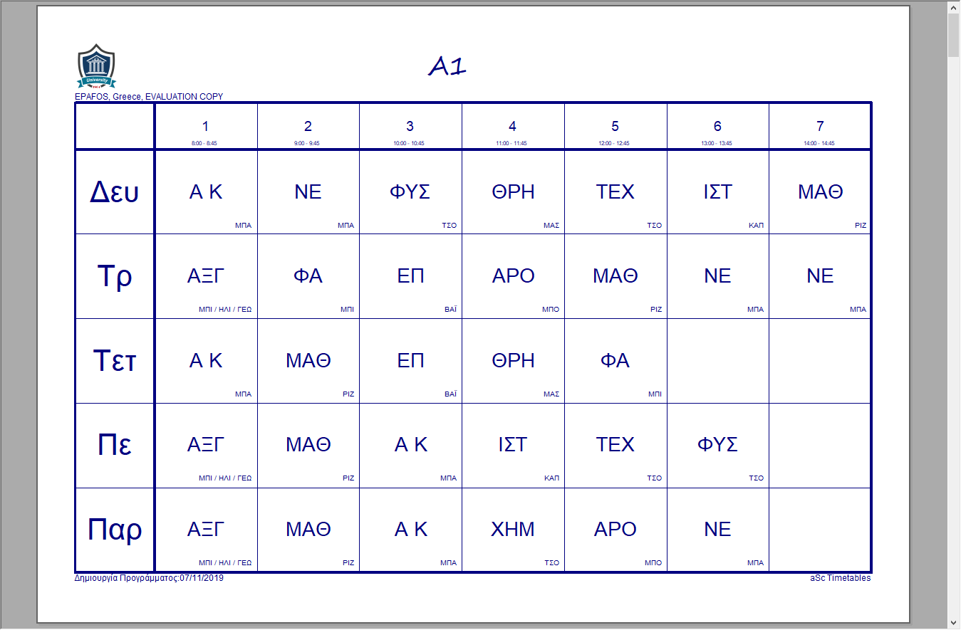 Το Advanced Timetables έρχεται με μία συλλογή έτοιμων εκτυπώσεων. Μπορείτε να επιλέξετε και να χρησιμοποιήσετε οποιαδήποτε από αυτές. Μπορείτε επίσης να επεξεργαστείτε και να δημιουργήσετε τις δικές σας εκτυπώσεις με το δικό σας λογότυπο, όνομα του εκπαιδευτηρίου και όλες τις πληροφορίες που απαιτεί το δικό σας Υπουργείο Παιδείας.