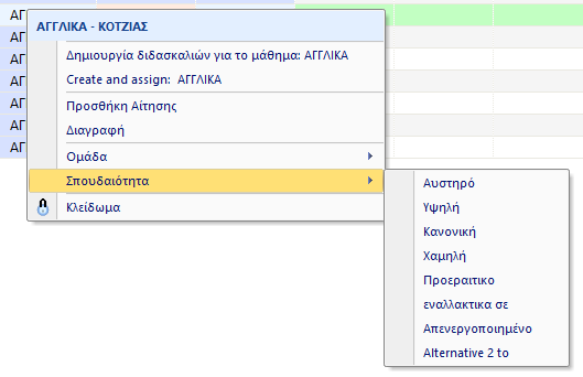 Μπορείτε να επιλέξετε έναν ή περισσότερους μαθητές, και κάνοντας δεξί κλικ στο κελί του αντίστοιχου μαθήματος να καθορίσετε την σπουδαιότητα της επιλογής του μαθητή για το συγκεκριμένο μάθημα.