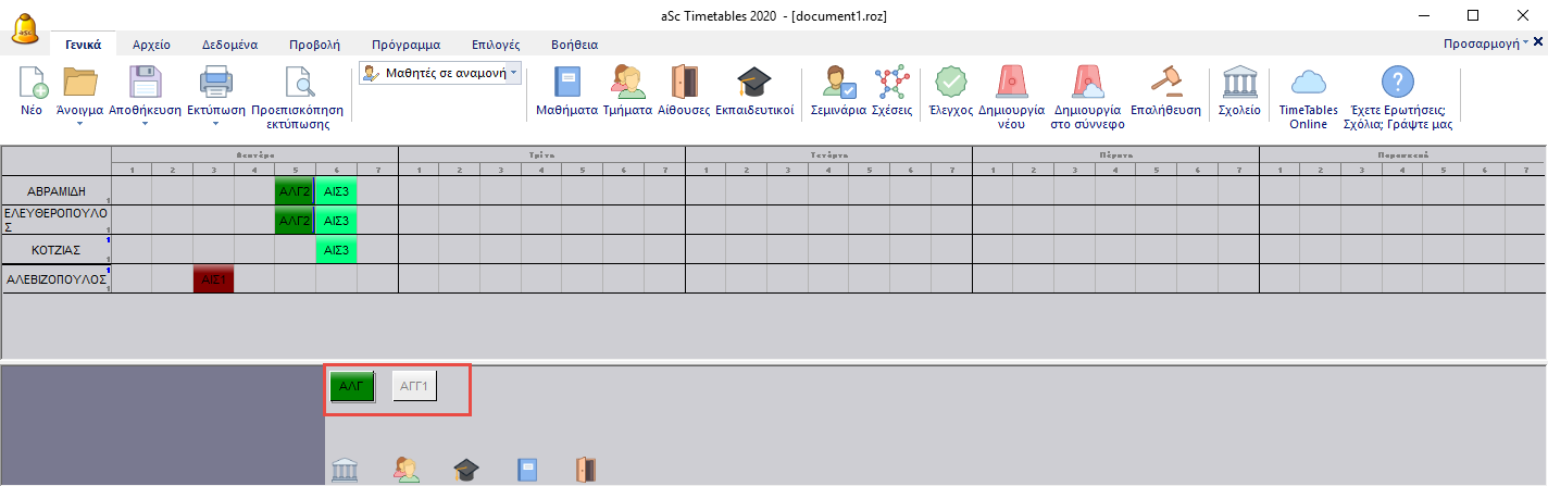 Η προβολή αυτή είναι βασικά η ίδια με την προβολή των μαθητών, με την μόνη διαφορά ότι εδώ μπορείτε να δείτε τους μαθητές εκείνους που κάποιες από τις διδασκαλίες μαθημάτων που έχουν επιλέξει δεν τοποθετήθηκαν στο ωρολόγιο πρόγραμμα. Τα ονόματα των μαθητών εμφανίζονται σε σειρές και οι κάρτες (διδασκαλιών) που δεν τοποθετήθηκαν στο ωρολόγιο πρόγραμμα, εμφανίζονται στο κάτω μέρος της οθόνης.